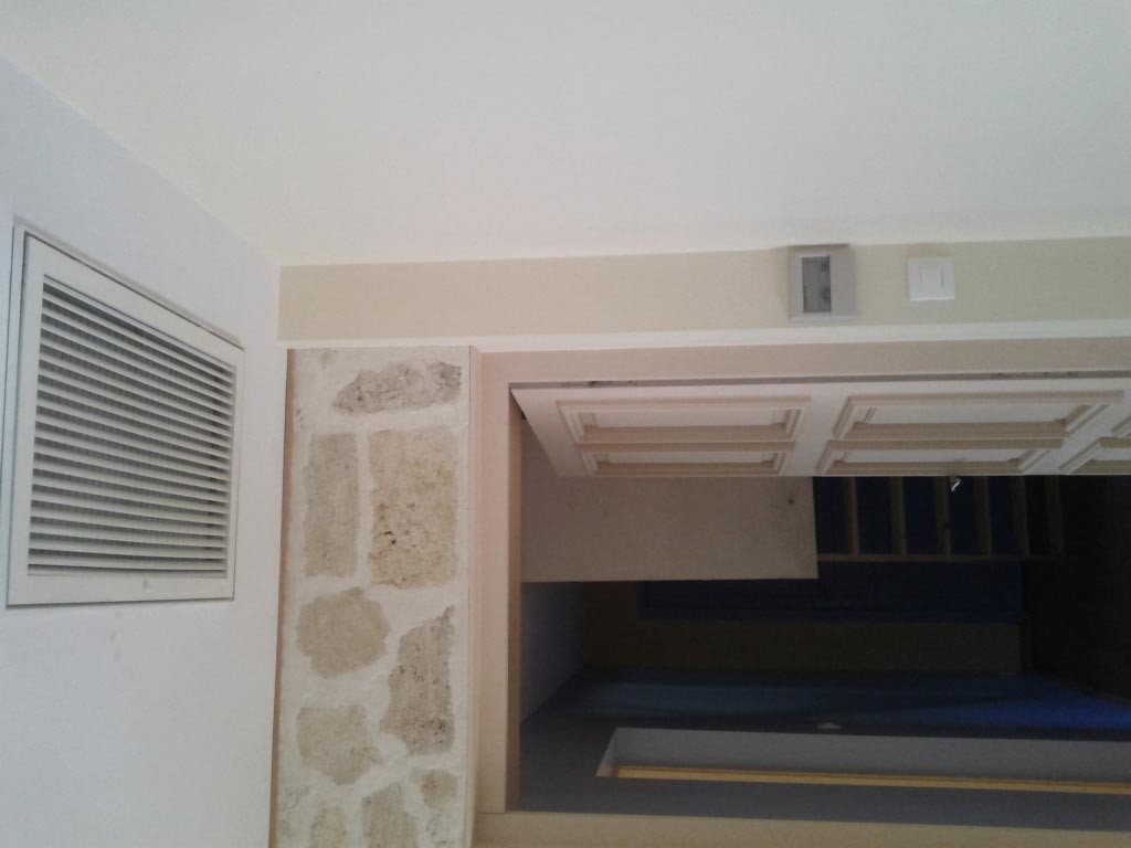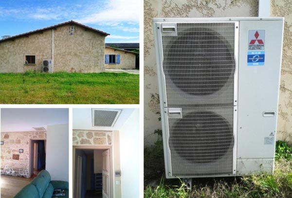Installation d'une pompe à chaleur Air / Air Gainable de marque MITSUBISHI pour chauffer et refroidir une maison de 100 M². L'air est distribué par des bouches type vmc en 160cm de diamètre au plafond et est repris par deux grilles de reprise.