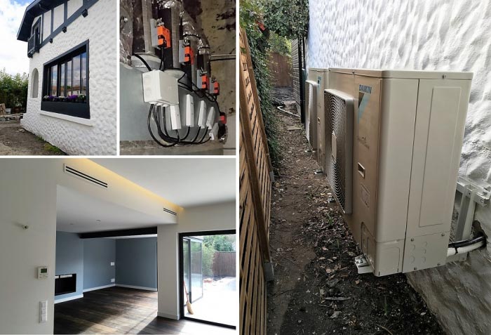 Installation de deux pompes à chaleur Air / Air Gainable de marque DAIKIN, d'une puissance de 13,62 Kw à -5°, pour chauffer et refroidir une maison d'un volume de 438 m³. L'air est distribué par des bouches au plafond, au mur et est repris par deux grilles de reprise.