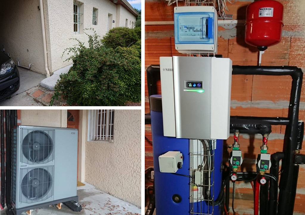 Installation d'une pompe à chaleur Air / Eau de marque NIBE de 16 kW en remplacement d'une chaudière fioul non condensation, sur une installation de radiateurs avec production d'eau chaude sanitaire, pour une maison de 160 m².. Après une étude thermique réalisée par nos soins la consommation chauffage sera divisée par 3: passant de 1500 € à 560€.