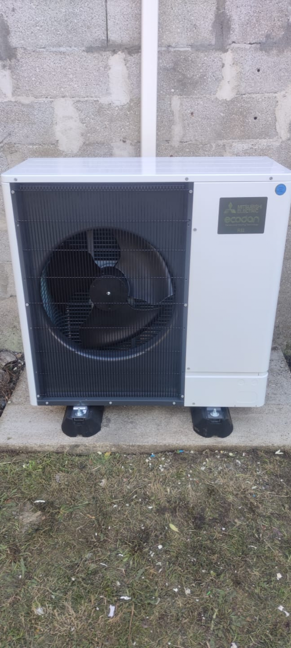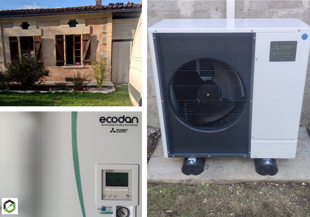 Installation d'une pompe à chaleur Air / Eau de marque MITSUBISHIS de 12 kW en remplacement de son ancien pompe à chaleur air/eau MITSUBISHI, sur une installation plancher chauffant, pour une maison de 180 m² près de Bordeaux