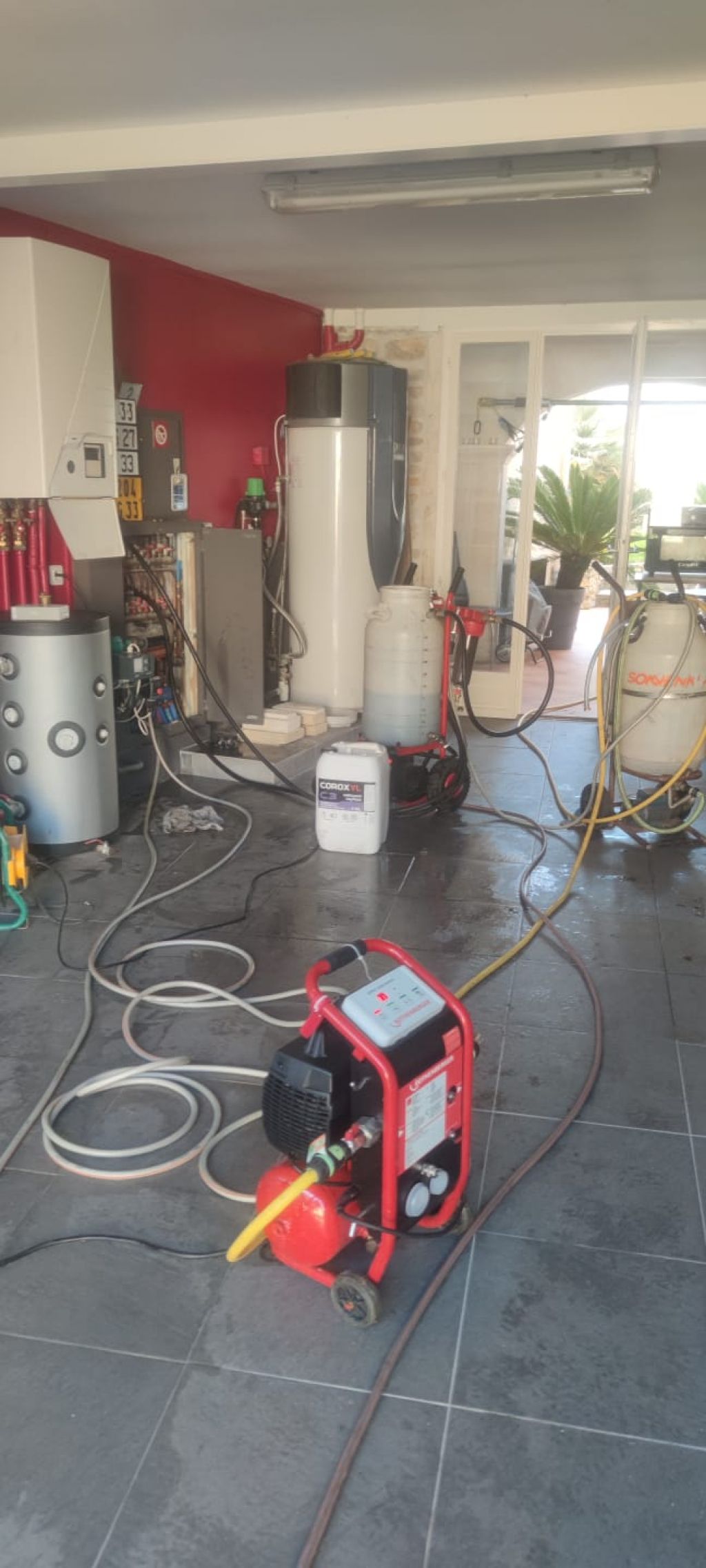 Remplissage et ajout d'un inhibiteur de corrosion dans le circuit de chauffage pour pérenniser l'installation.