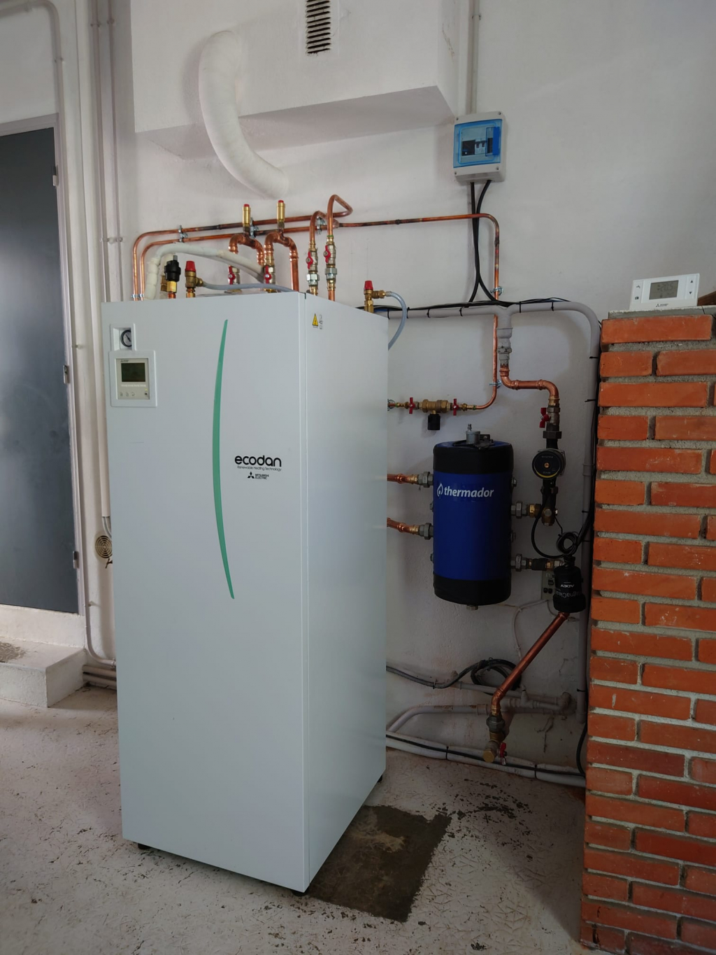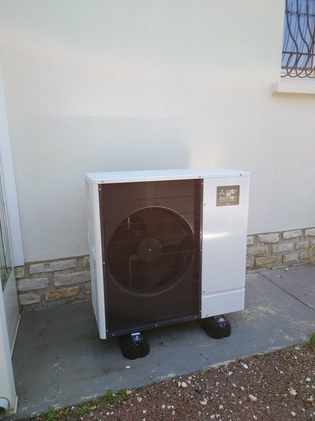 Installation d'une pompe à chaleur air/eau de marque MITSUBISHI de 10 kW avec préparateur ECS 200 litres intégré en remplacement d'une chaudière gaz non condensation pour une maison de 85 m²