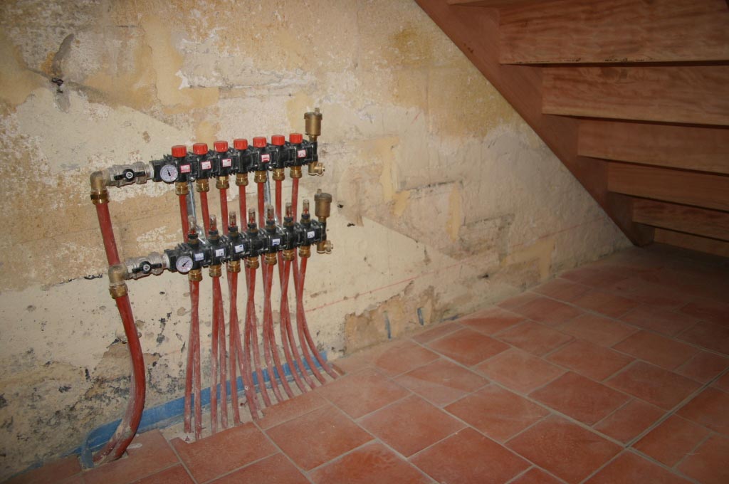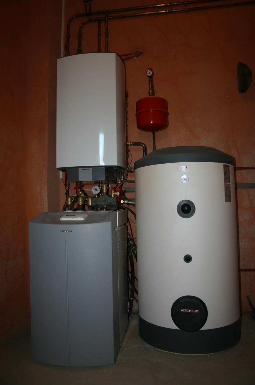 Pompe à chaleur Géothermie sur forage nappe à une profondeur de 40m pour un débit de utile de 2m3/h. Maison de 140m² avec un plancher chauffant au rez de chaussée et radiateur acier à l'étage. Ballon tampon de 100l avec gestion de 2 t° de départ chauffage ( plancher et radiateurs ) + production eau chaude sanitaire de 300l.